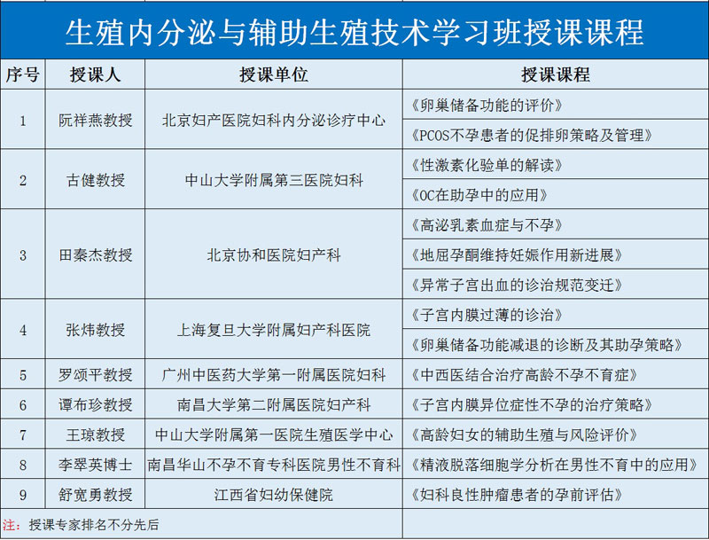 北京协和医院、北京大学第三医院、首都医学大学附属北京妇产医院、中山大学第一附属医院、广州中医药大学第一附属医院、中山大学第三附属医院、南昌大学附属第二医院、江西省妇幼保健院、南昌华儿山生殖医院等全国九大大国内权威医院对于4月23—24日在江西南昌对国内以及江西省内各级医院妇产科、生殖医学中心、不孕不育科等相关科室医生开展临床技术培训学习班,针对疑难不孕不育症治疗进行探讨。